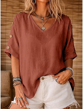 Dam Skjorta Blus Bomullskjorta Konstbomullslinne Knappar Ensfärgat Stylish Ledigt 3/4 ärm Rund hals Vanliga toppar Dagligen Svart Vit Rodnande Rosa Marinblå Orange Sommar Vår