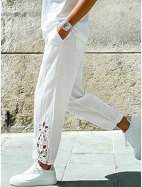 Dam Sommarbyxor 100% Bomuld Beskurna byxor Mode Streetwear Komfort Ankellång Medium Midja Slät Spets Bekväm Gata Dagliga kläder Utekväll Svart Vit Grön Kaki Sommar Normal