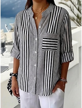 Dam Skjorta Casual skjorta Bomullskjorta Konstbomullslinne Ficka Knappar Randig Stylish Klassisk Modern Långärmad Tröjkrage Vanliga toppar Dagligen Helgdag Utekväll Svart Sommar Vår