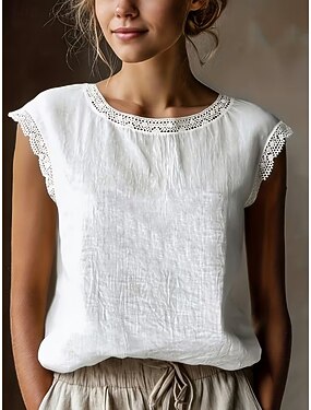 Dam Summer Tops Blus Konstbomullslinne Rynkad Lappverk Broderad Ensfärgat Elegant damer Stylish Ärmlös U-hals Vanliga toppar Dagligen Arbete Utekväll Vit Champagne Rodnande Rosa Ljuslila Sommar Vår