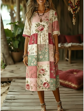 Dam Midiklänning Konstbomullslinne Boho-klänning Skiftklänning Kaftanklänning Vintage Dagligen Utomhus Strand Normal Blommig Halvlång ärm Rund hals Grön Sommar Vår