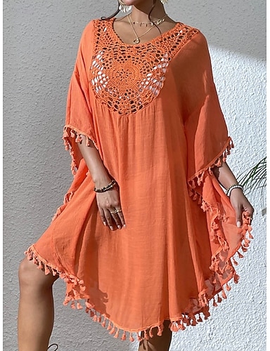 Kvinnors cover up baddräkt klänning spets patchwork frans semester strandkläder enfärgad rund hals lång ärm baddräkt