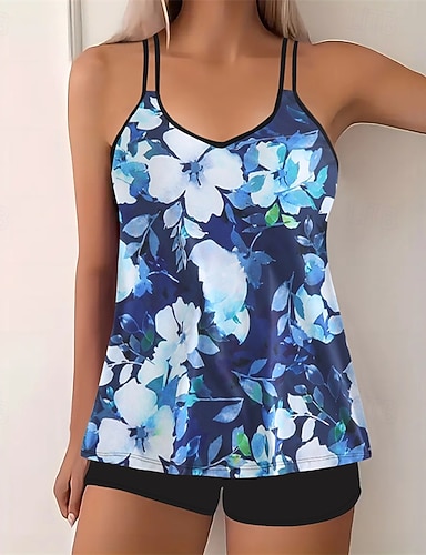 Dam Badkläder Bikini Tankini 2 st Kaxig Baddräkt Djup V-hals Tryck upp Stickat Semester Tropisk Blommig Färgblock Doppa Ärmlös Baddräkter