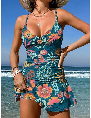 Dam Badkläder En bit Kjol Baddräkt Elegant Semester Blommig Grafisk V-hals Ärmlös Baddräkter