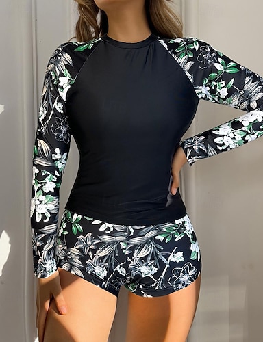 Kvinnors bikini 3-delad baddräkt palm boyleg slimmad rygglös semester strandkläder blommig halterneck ärmlösa långärmad baddräkter