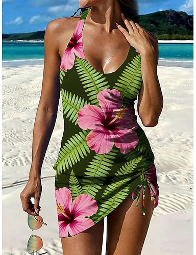 Dam Badkläder Tankini 2 st Kjol Baddräkt Snörning Halterneck Elegant Semester Blommig Löv Rundhals Ärmlös Baddräkter