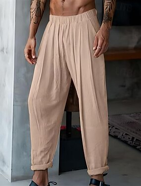 Herr Linne Byxor Långbyxor Sommarbyxor Strandbyxor Snörning Ficka Elastisk midja Slät Komfort Andningsfunktion Semester Dagligen Helgdag Hawaiisk Boho 다크 카키 Svart
