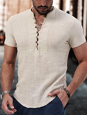 Herr Skjorta Linneskjorta Popover skjorta Sommarskjorta Standkläder Bandkrageskjorta Slät Semester Curise Svart Vit Rodnande Rosa Grön Kortärmad Henley Sommar Kläder