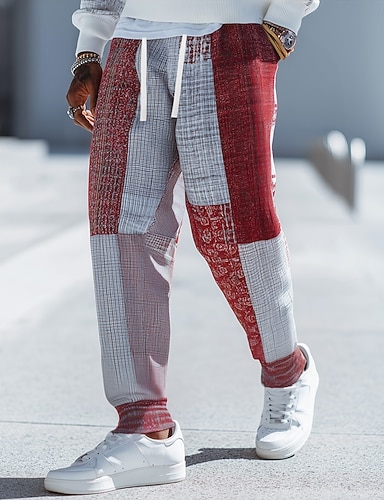 Herr Färgblock Lappverk Joggingbyxor Joggare Långbyxor Medium Midja Dragsko Elastisk midja Vintage Etnisk Joggning Streetwear Träningspass Atletiska mjukisbyxor med fickor Vår Höst 3D-tryck Rubinrött