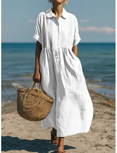 Dam Midiklänning Konstbomullslinne Skjortklänning Kaftanklänning Mode Modern Dagligen Utomhus Semester Normal Slät Kortärmad Tröjkrage Blå Svart Vit Gul Sommar Vår