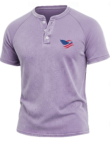 Herr Amerikanska självständighetsdagen Årgång Tvättad Bomullskjorta Henley Top Syratvättad skjorta Kortärmad Vintage Designer Ledigt Ledigt Dagligen Utomhus Sommar Vår Alla årstider Ljusblå Purpur Grå