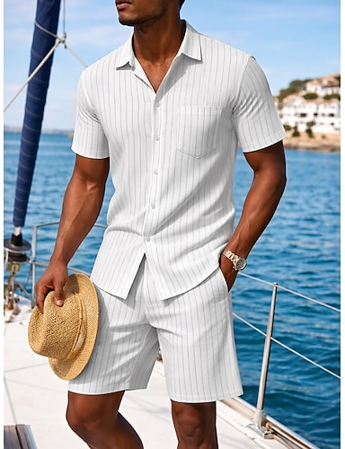 Herr Linneskjorta 2 delar Skjorta set Och Shorts Linne Shorts Beach Shorts Uppsättning Vertikala remsor Ledigt Dagligen Utomhus Nedvikt Kortärmad Sommar Mode Ledigt Bekväm Kläder