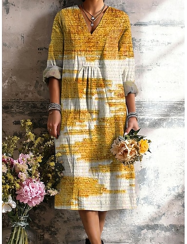 Dam Midi Klänning V-hals Lång ärm Kaftan Lätt Loose Fit Avslappnad Klänning A-linje Klänning Avslappnad Boho Fest Loose Fit Grafisk Geometrisk Abstrakt Lång ärm V-hals Gul Rosa Blå Brun Höst