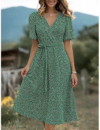 Dam Midiklänning Vardagsklänning Chiffongklänningar A linjeklänning Blommig klänning Elegant Vintage Mode Utomhus Semester Utekväll Normal Prickig Kortärmad V-hals Blå Svart Gul Ljusgrön Sommar Vår