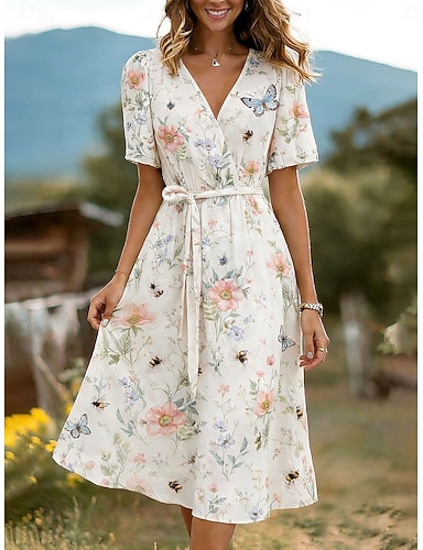 Dam Midiklänning A linjeklänning Bandage Dress Volangkjol Semester Ledigt Helgdag Datum Normal Blommig Grafisk Kortärmad V-hals Rodnande Rosa Purpur Grön Beige Sommar Vår