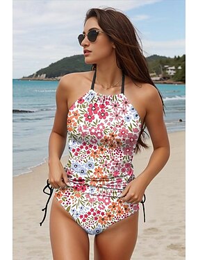 Kvinnors tankini 2-delad baddräkt rynkad söt rygglös semester strandkläder blommig halterneck ärmlös baddräkt