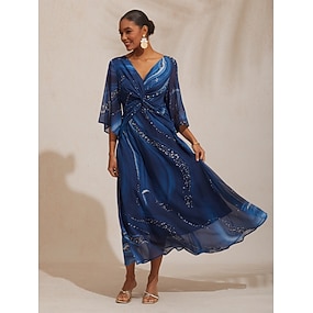 kvinnors bröllopsgäst cocktailklänning chiffong vanlig volang vriden elegant sommar maxiklänning v-ringad utsvängd 3/4 lång ärm