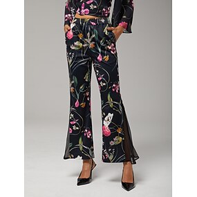 dambyxor stretchigt tyg blommigt tryck chiffong transparenta paneler utsvängda ben resår i midjan elegant bekväm dagligt arbete höst