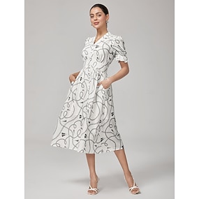 Dam Vardagsklänning Midiklänning Vit Kortärmad Kedjor Skriv ut Puffärm Sommar Höst V-hals Semester Nutida XS S M