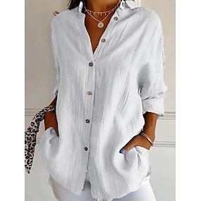 Dam Skjorta Knapp Upp Blus Konstbomullslinne Knappar Ensfärgat Grundläggande Ledigt Långärmad Tröjkrage Vanliga toppar Dagligen Blå Vit Rodnande Rosa Vår Höst