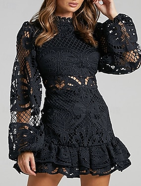 Dam Mini klänning Svart klänning Spetsklänning Utskuren klänning Sheath Dress Mode Modern Mesh ärm Puffärmad Kontor Utekväll Normal Blommig Långärmad Hög krage Svart Vit Rodnande Rosa Ljusröd Vår Höst
