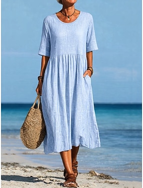 Dam Midiklänning 100% Bomuld Skiftklänning Klänningar i bomullslinne Vardagsklänning Mode Grundläggande Klassisk Dagligen Strand Helgen Normal Slät Halvlång ärm Rund hals Vit Rodnande Rosa Ljusblå