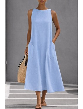 Dam Knälång klänning Konstbomullslinne Skiftklänning Solklänning Strandklänning Elegant Mode Modern Utomhus Semester Utekväll Normal Slät Ärmlös Rund hals Ljusblå Sommar Vår