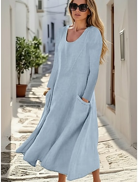 Dam Midiklänning Klänningar i bomullslinne Skiftklänning Mode Modern Dagligen Utomhus Semester Lös passning Slät Långärmad Rund hals Vit Ljusgrön Rodnande Rosa Ljusblå Sommar Vår Höst