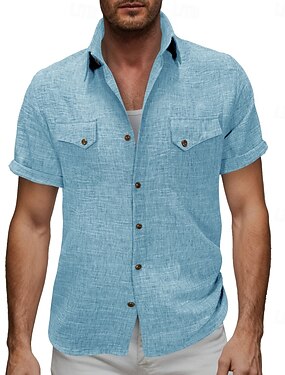 Herr Skjorta Linneskjorta Knapp upp skjorta Ensfärgat Utomhus Semester Svart Vit Ljusgrön Mörkgrön Kortärmad Tröjkrage Sommar Vår Kläder Ficka
