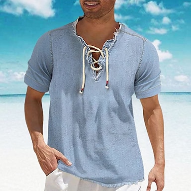 Herr Skjorta Chambray skjorta Calico skjorta Sommarskjorta Standkläder Casual skjorta Marinblå Blå Ljusblå Kortärmad Slät Denim V-hals Dagligen Semester Snörning Kläder Bomullsblandning Mode Designer