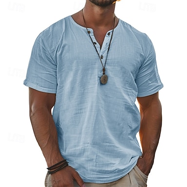 Herr Linneskjorta T-shirt Henleytröja Kortärmad tröja Kortärmad V-hals Sommar Vår Ensfärgat Streetwear Stylish Ledigt Lappverk Knappar Slät Ledigt Dagligen Utomhus Vit Svart Khaki grön Topp t-shirt