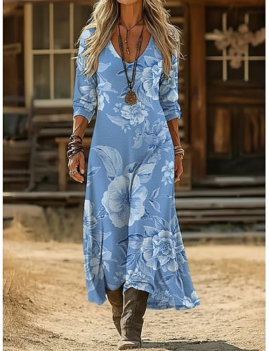 Dam Maxiklänning Boho-klänning Vintage klänning Vardagsklänning Vintage Dagligen Utomhus Semester Lös passning Blommig Långärmad V-hals Blå Ljusgrön Marinblå Mörkgrön Vår Höst