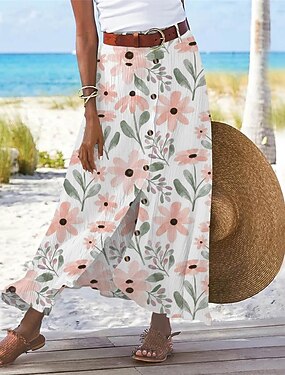 kvinnors kjolar i bomullslinne mode casual maxi kjolar med hög midja blommigt tryck kluvna toppar casual dagligen ljusrosa gul rosa blå sommar