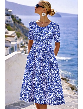 Dam Midiklänning Skiftklänning Semester Ledigt Normal Blommig Grafisk Bohemisk Halvlång ärm Rund hals Blå Orange Grön Beige Sommar Vår