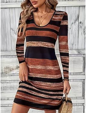 Dam Knälång klänning Solklänning Stickad klänning Vardagsklänning T shirtklänning Ledigt Normal Grafisk Geometrisk Rand Långärmad Rund hals Brun Höst Vinter