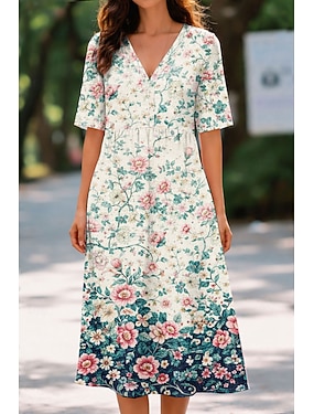 Dam Midiklänning Boho-klänning Solklänning Vardagsklänning Elegant bohemliv Semester Strand Helgdag Datum Normal Blommig Grafisk Kortärmad V-hals Blå Rodnande Rosa Grön Sommar Vår