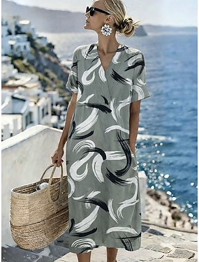 Dam Midiklänning Solklänning Vardagsklänning Semester Ledigt Strandstil Strand Fest Lös passning Grafisk Geometrisk Kortärmad V-hals Grön Sommar Vår