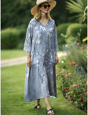 Kvinnors maxiklänning i linne som andas lättviktig sommarklänning A-linjeformad klänning semester avslappnad boho strand lös passform blommigt grafiskt 3/4 ärm V-ringad blå rosa lila beige sommar vår