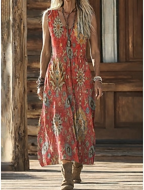 Dam Midiklänning Boho-klänning Linneblandning Skjortklänning Solklänning Elegant bohemliv Etnisk Strand Helgdag Normal Grafisk Geometrisk Ärmlös V-hals Rubinrött Beige Sommar Vår