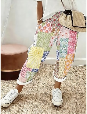Dam Konstbomullslinne Brett skaft Casual byxor Sommarbyxor Semester Mode Streetwear Ankellång Medium Midja Blommig Grafisk Snörning Lappverk Ficka Bekväm Komfort Mateial som andas Oelastisk Dagligen