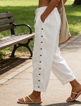 Dam Cotton Långbyxor Sommarbyxor Strandbyxor Semester Mode Ledigt vardag Ankellång Hög midja Slät Elastisk midja Sidoknapp Lättvikt Bekväm Andningsfunktion Oelastisk Streetwear Strand Helgdag Bl