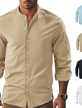 Herr Skjorta linneskjorta Bandkrageskjorta Popover skjorta Sommarskjorta Standkläder Slät Semester Curise Svart Vit Blå Långärmad Bandkrage Vår & sommar Kläder