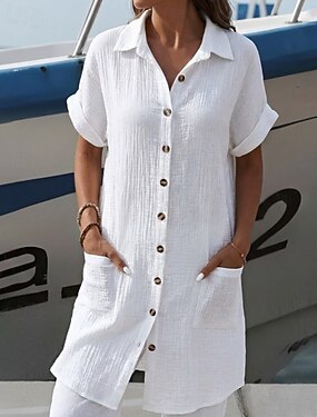 Dam Skjorta Knapp Upp Blus Konstbomullslinne Knappar Slät Grundläggande Modern Kortärmad Tröjkrage Vanliga toppar Dagligen Helgdag Utekväll Vit Sommar