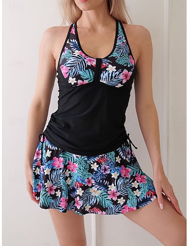 Kvinnors Tankini 2-delad baddräkt Rynkad Palm Kjol Magekontroll Hög midja Slim Backless Semester Strandkläder Blommiga Löv U-hals Ärmlös Badkläder