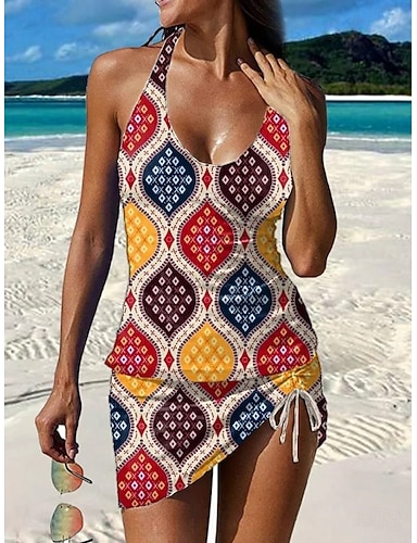 Dam Badkläder Tankini Kjol Baddräkt Semester Vintage Grafisk Geometrisk Halterneck Ärmlös Baddräkter