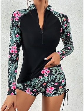 Kvinnors tankini 2-delad baddräkt zip-fram palm shorts magkontroll hög midja smal rygglös semester strandkläder blommig rund hals lång ärm baddräkter