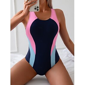Kvinnors enbitar baddräkt smalnande färgblock monokini mage kontroll hög midja smal rygglös semester strandkläder färgblock U-hals ärmlösa baddräkter