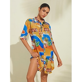 semester citrus trädgård silkeslen satin rak skjortklänning