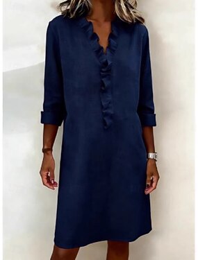 Dam Midiklänning Konstbomullslinne Skiftklänning Ledigt Dagligen Lös passning Slät Långärmad V-hals Marin Rodnande Rosa Rubinrött Sommar Vår Höst