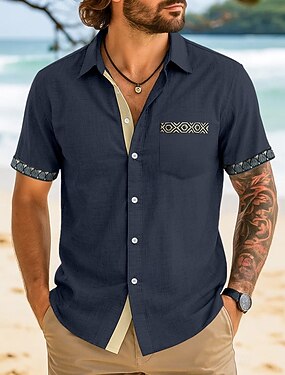 Herr Skjorta Linneskjorta Sommarskjorta Standkläder Knapp upp skjorta Färgblock Dagligen Semester Marinblå Grön Kortärmad Nedvikt Vår & sommar Sommar Kläder